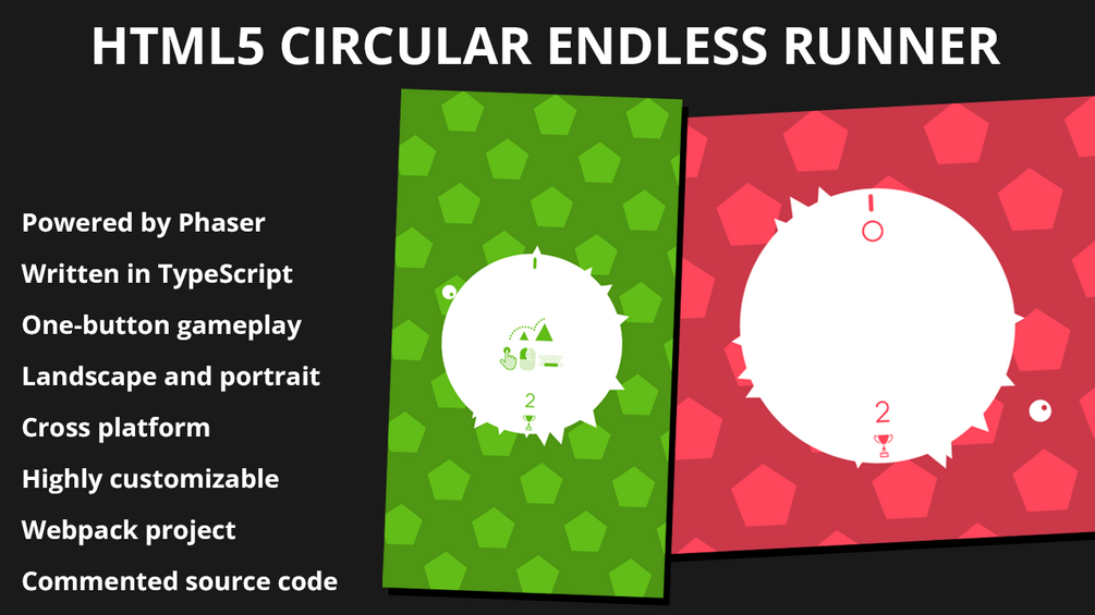 Full commented source code of a complete HTML5 circular endless runner using Phaser framework all written in TypeScript.